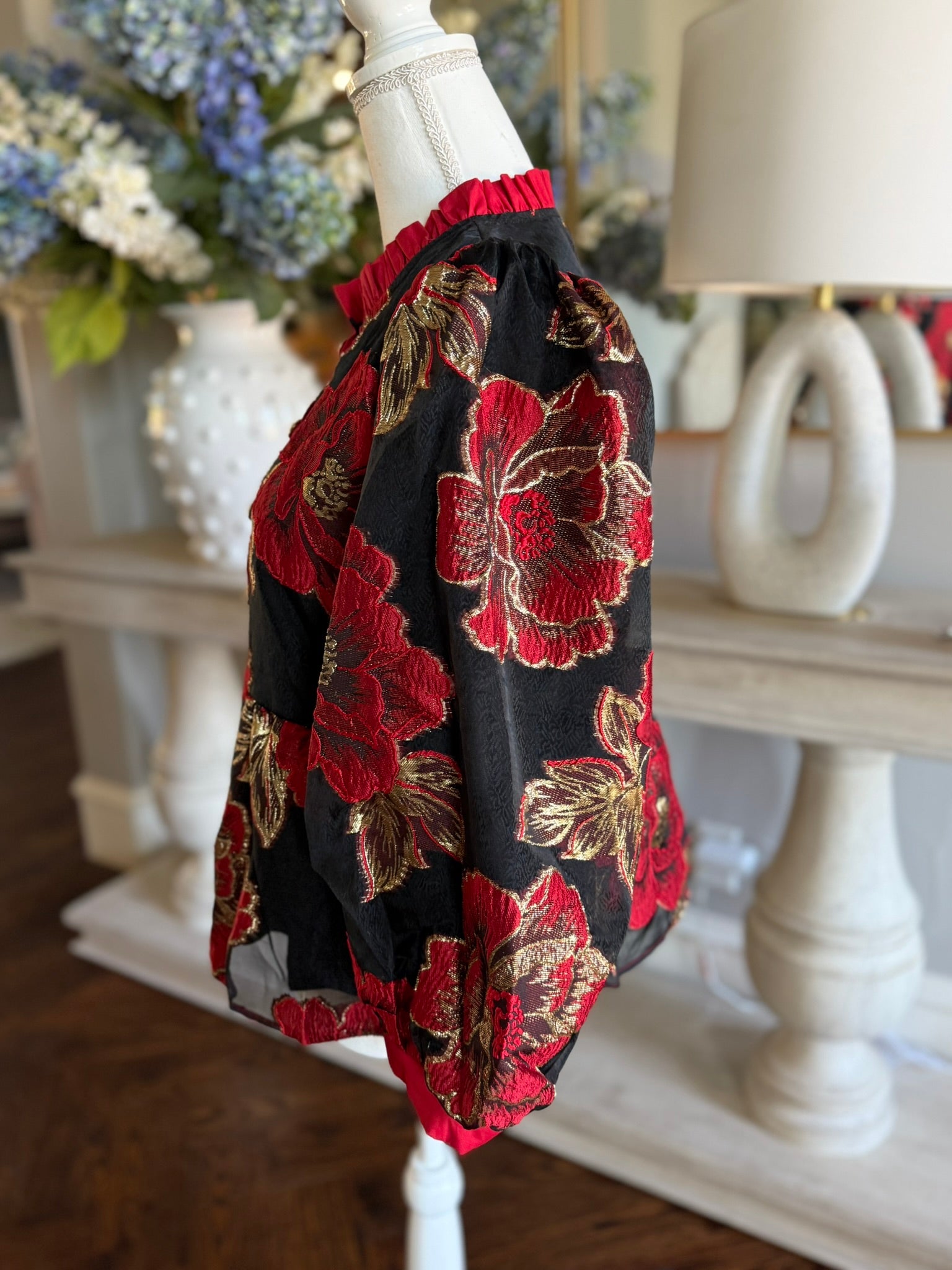 Turn heads at your next party or girls’ night out with the Amanda Top. Featuring playful puffed 3/4 sleeves and a ruffled neckline, this button-down peplum design boasts a vibrant red floral jacquard pattern with shimmering gold accents on a sleek black background. It’s the perfect mix of flirty and elegant to keep your style blooming all evening long. 100% polyester, hand washing recommended.