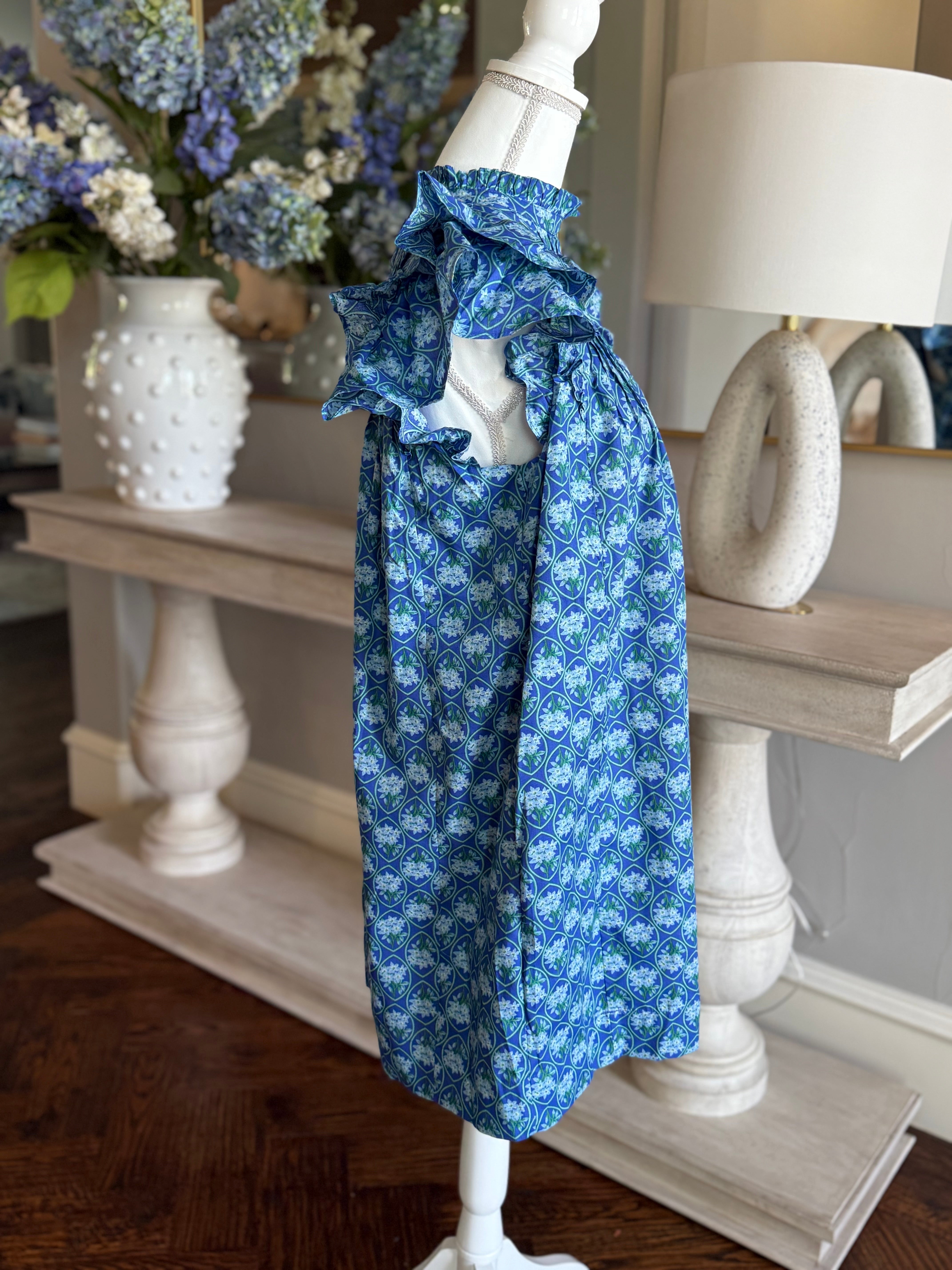 The Amber Dress features elegant layered ruffle cap sleeves that beautifully frame a refined mock neck and a pleated front, creating a sophisticated silhouette. Crafted from 100% cotton with a polyester lining, this mini dress offers both comfort and structure. A discreet back button closure at the neck adds a polished finishing touch. Handwash recommended to maintain its delicate details and quality.