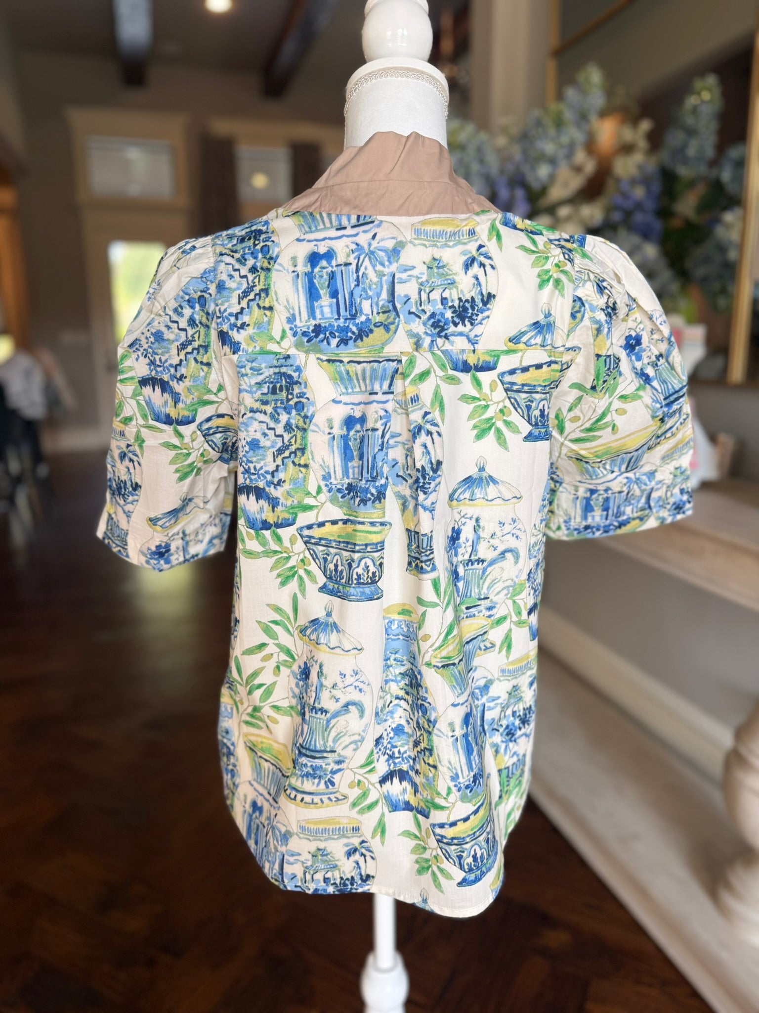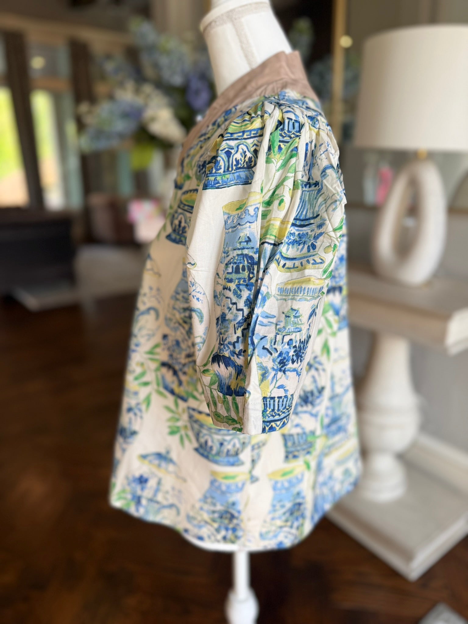 The Andrea Top in beige showcases elegant puffed sleeves and refined fabric-covered buttons, creating a sophisticated and timeless piece. Its tailored design offers a graceful silhouette, perfect for enhancing both professional and chic casual ensembles. Cotton. Entro.