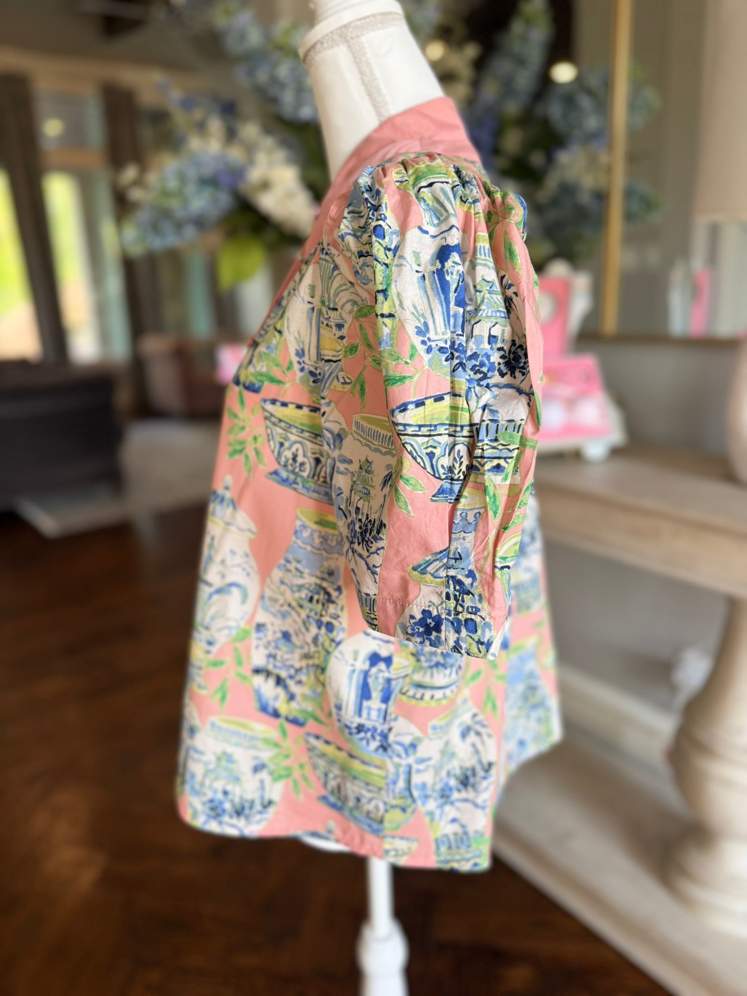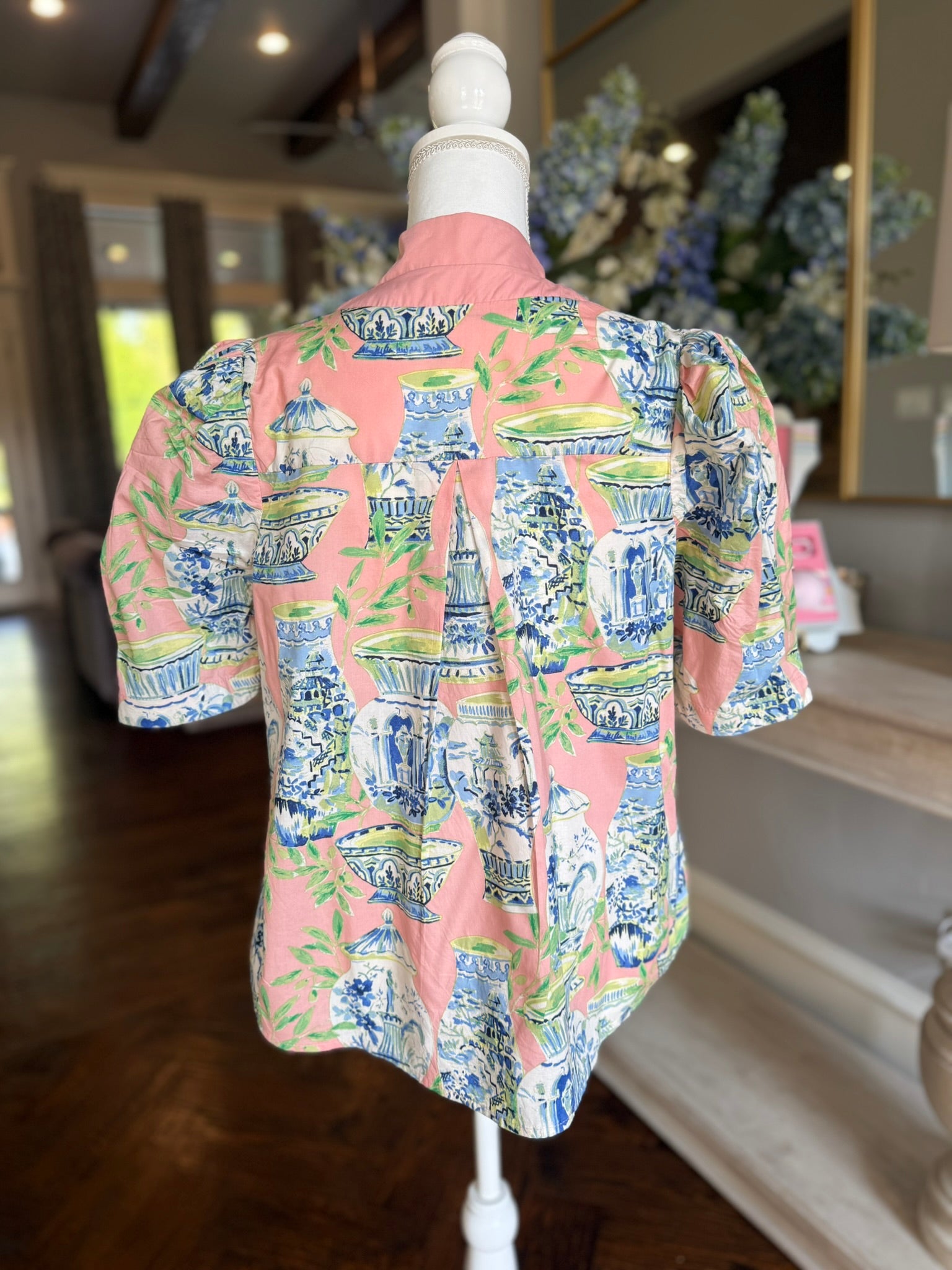 The Andrea Top in Pink showcases elegant puffed sleeves and refined fabric-covered buttons, creating a sophisticated and timeless piece. Its tailored design offers a graceful silhouette, perfect for enhancing both professional and chic casual ensembles. Cotton. Entro.
