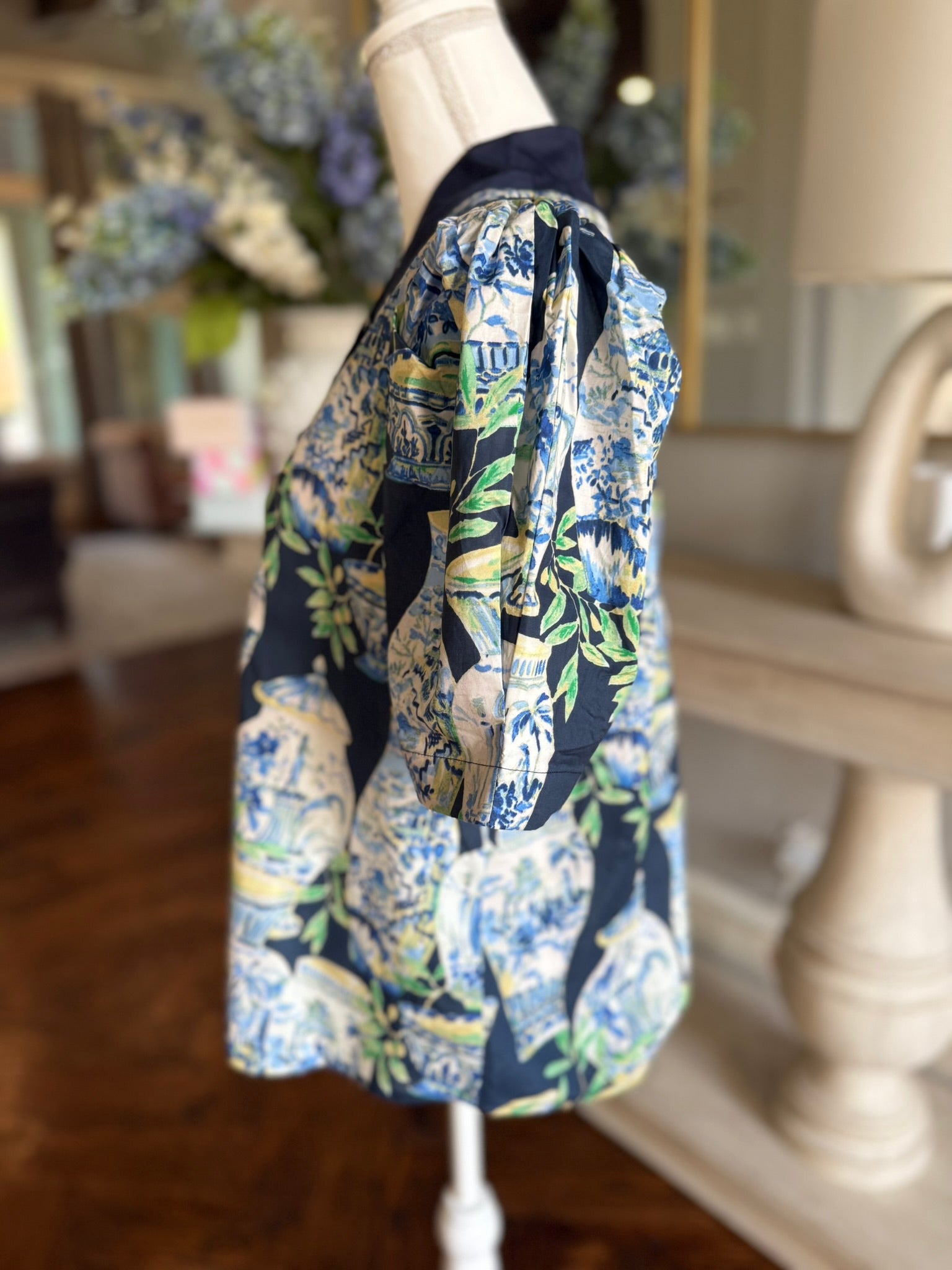 The Andrea Top in blue showcases elegant puffed sleeves and refined fabric-covered buttons, creating a sophisticated and timeless piece. Its tailored design offers a graceful silhouette, perfect for enhancing both professional and chic casual ensembles. Cotton. Entro.
