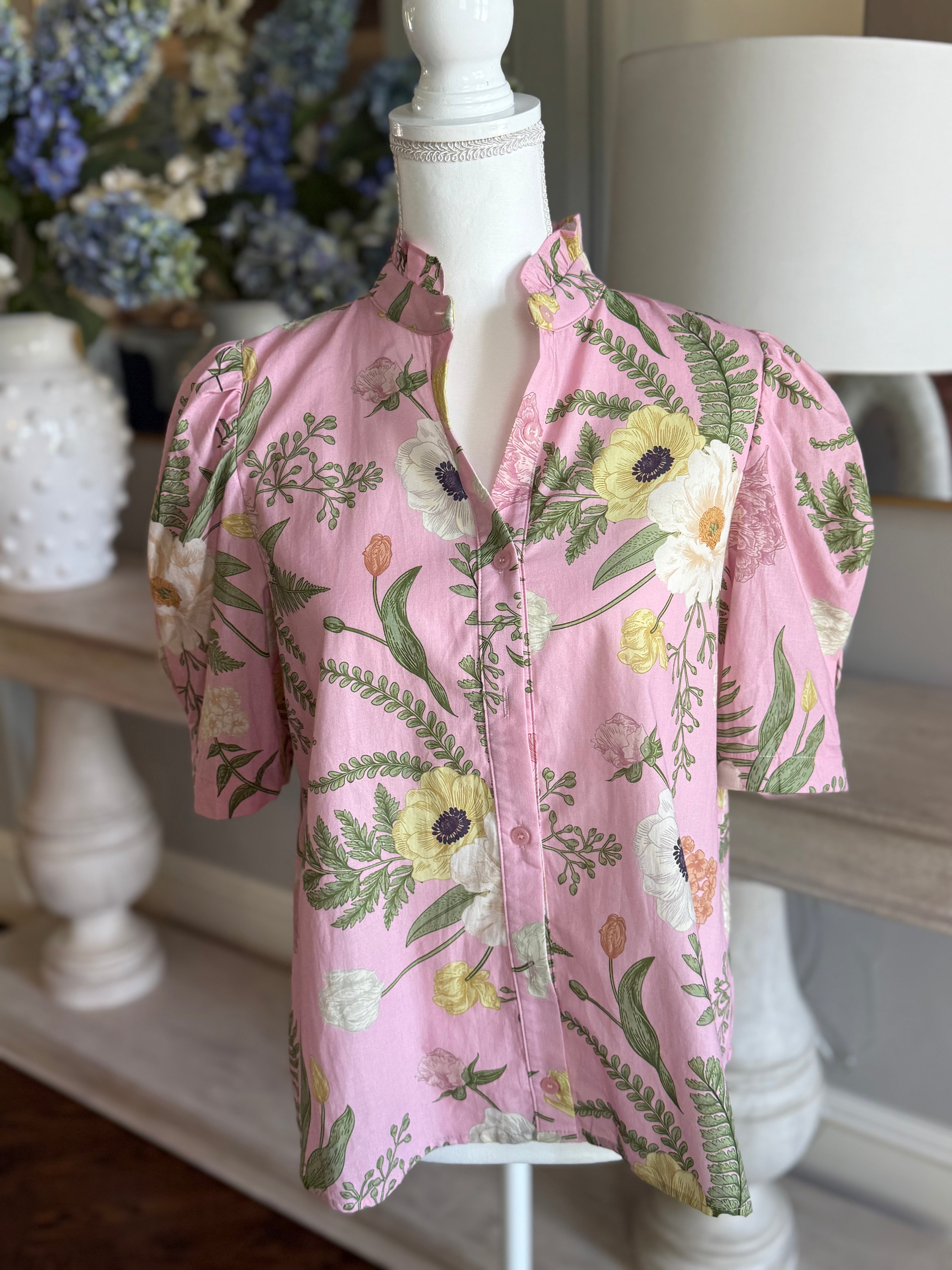 The Belle Top by Entro features a delicate pink fabric adorned with a charming floral pattern. Crafted from 100% cotton, this blouse offers breathable comfort and a soft touch. Its button-front design is complemented by a refined ruffle collar, adding a subtle feminine detail. For longevity, hand washing is recommended to maintain the fabric’s quality and vibrant print. Ideal for those seeking an elegant yet comfortable wardrobe staple.