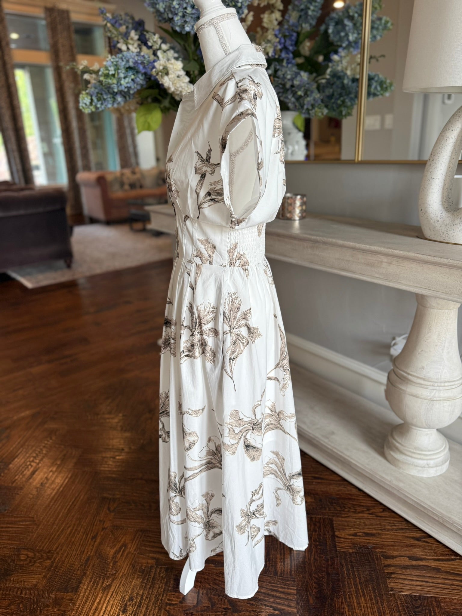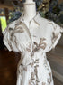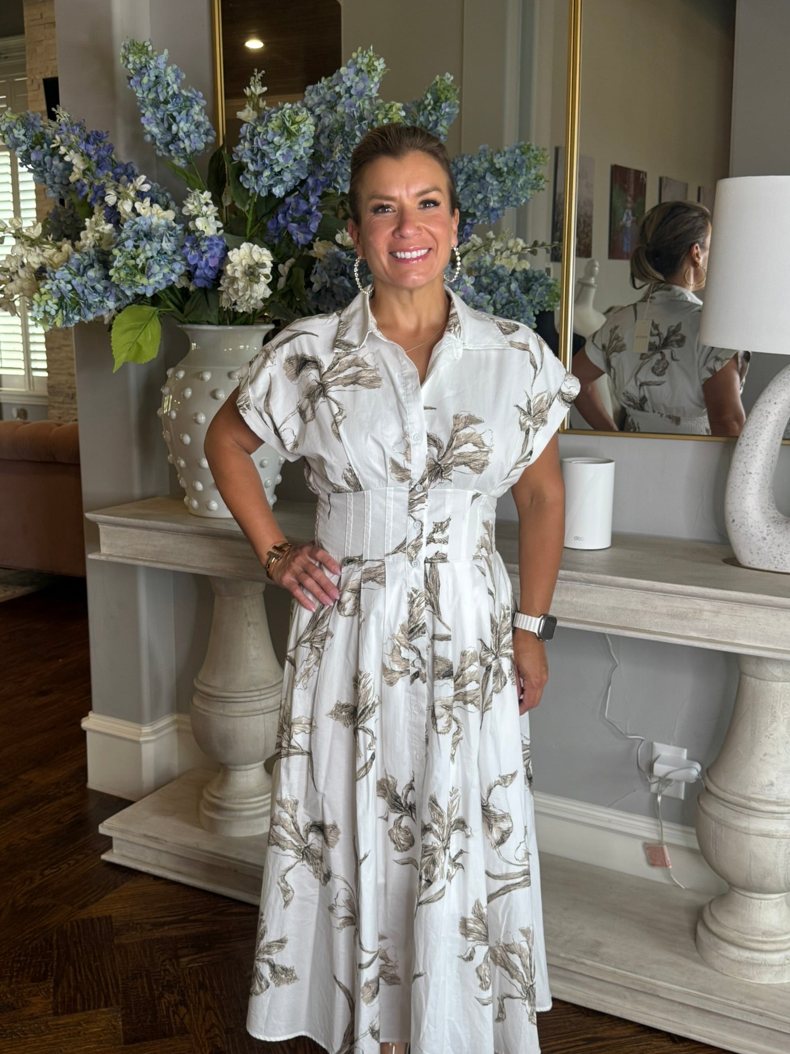 The Emily Dress brings fresh charm with its crisp 100% cotton fabric and playful white and tan print. Featuring cuffed sleeves and smart boning at the waist, it shapes a flattering silhouette while keeping comfort in mind. Fully lined and equipped with handy pockets, it’s as practical as it is pretty. For lasting love, hand wash is recommended—because great style deserves gentle care!