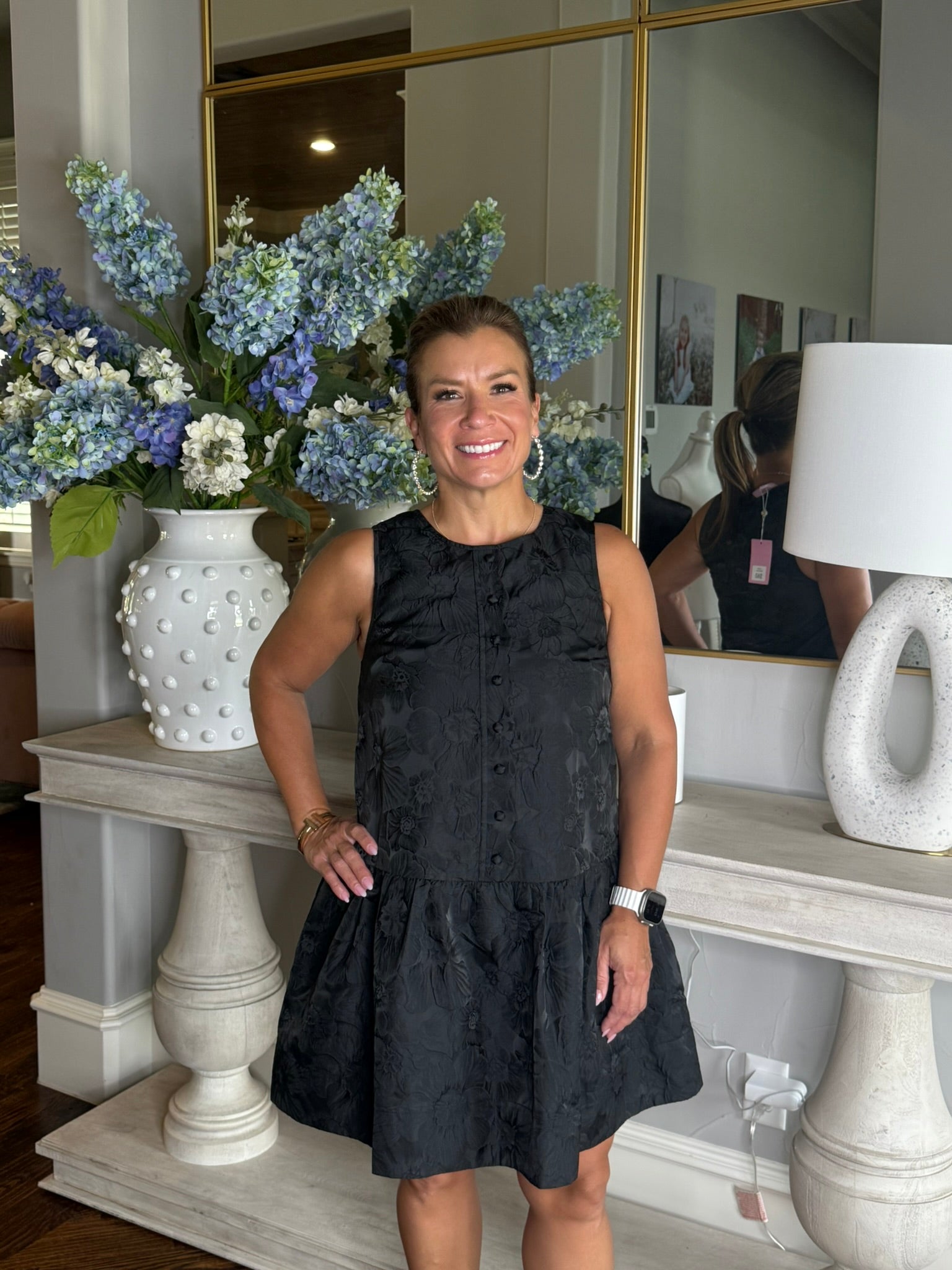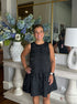 Step out in style with the Heather Dress, a playful black sleeveless jacquard piece featuring charming scallop details and decorative buttons. Lined for comfort and perfect on its own or layered with a collared blouse, it's your go-to for date night, church, or any special occasion. Crafted from 100% polyester and true to size for easy dressing.