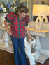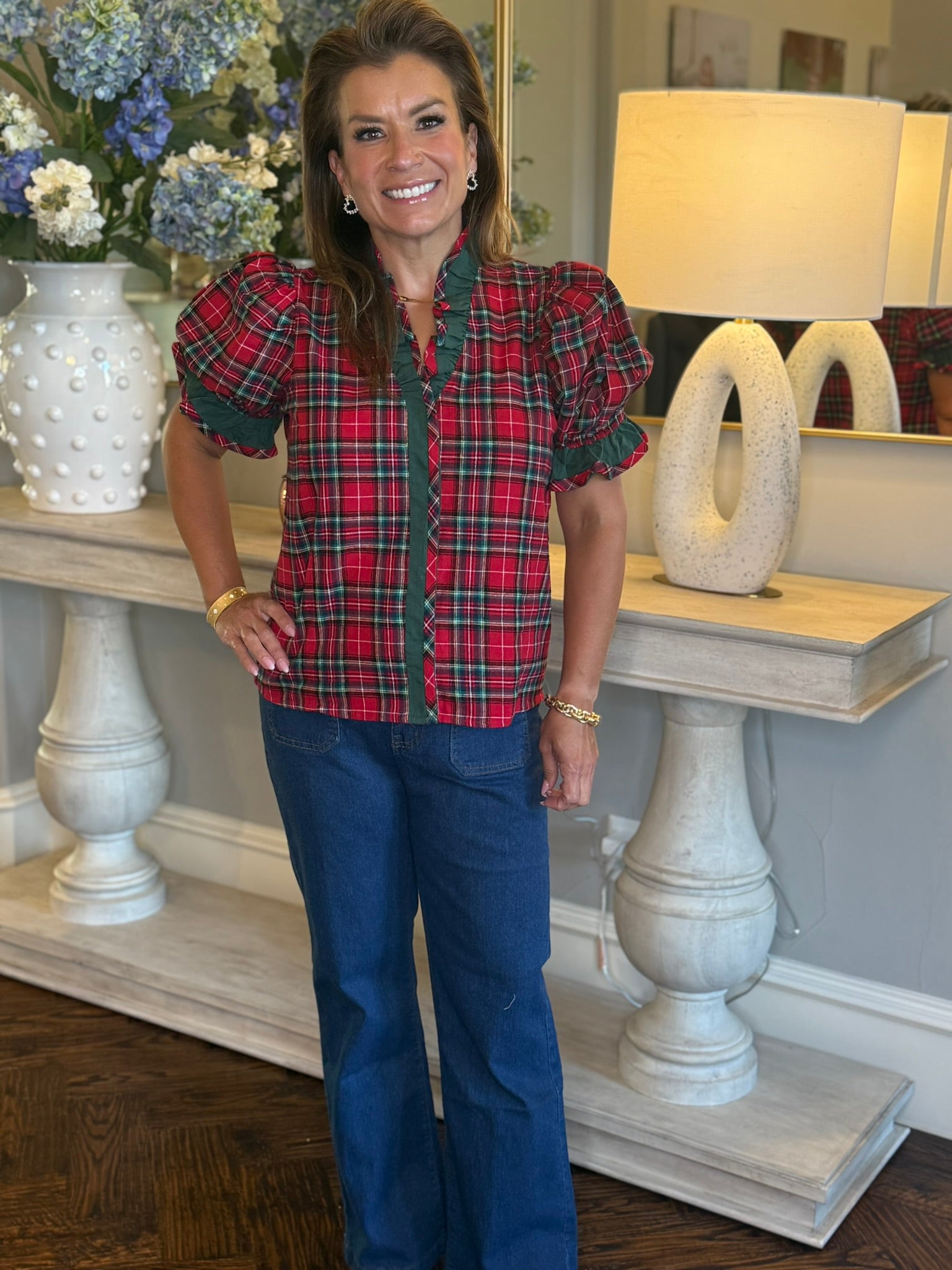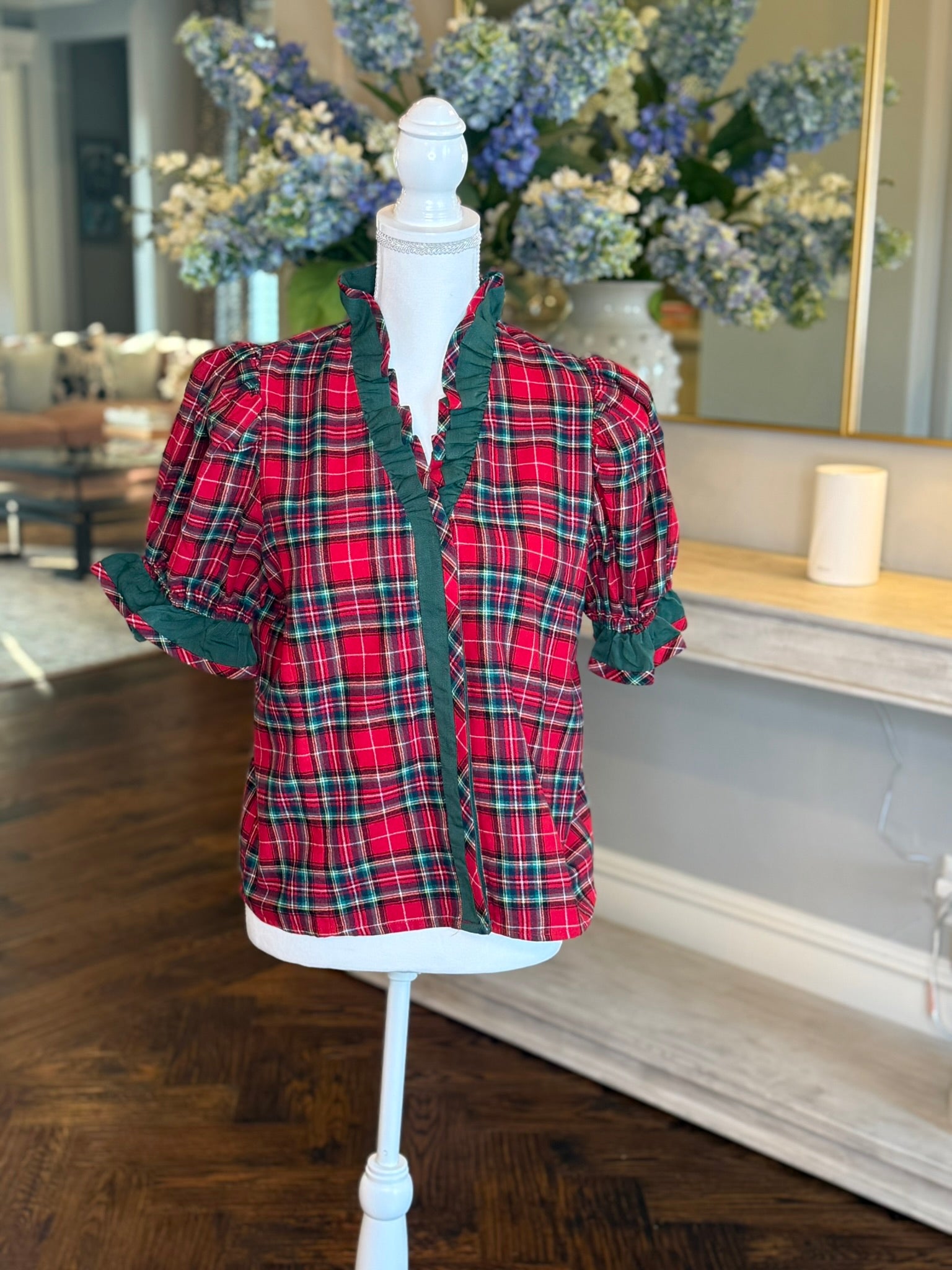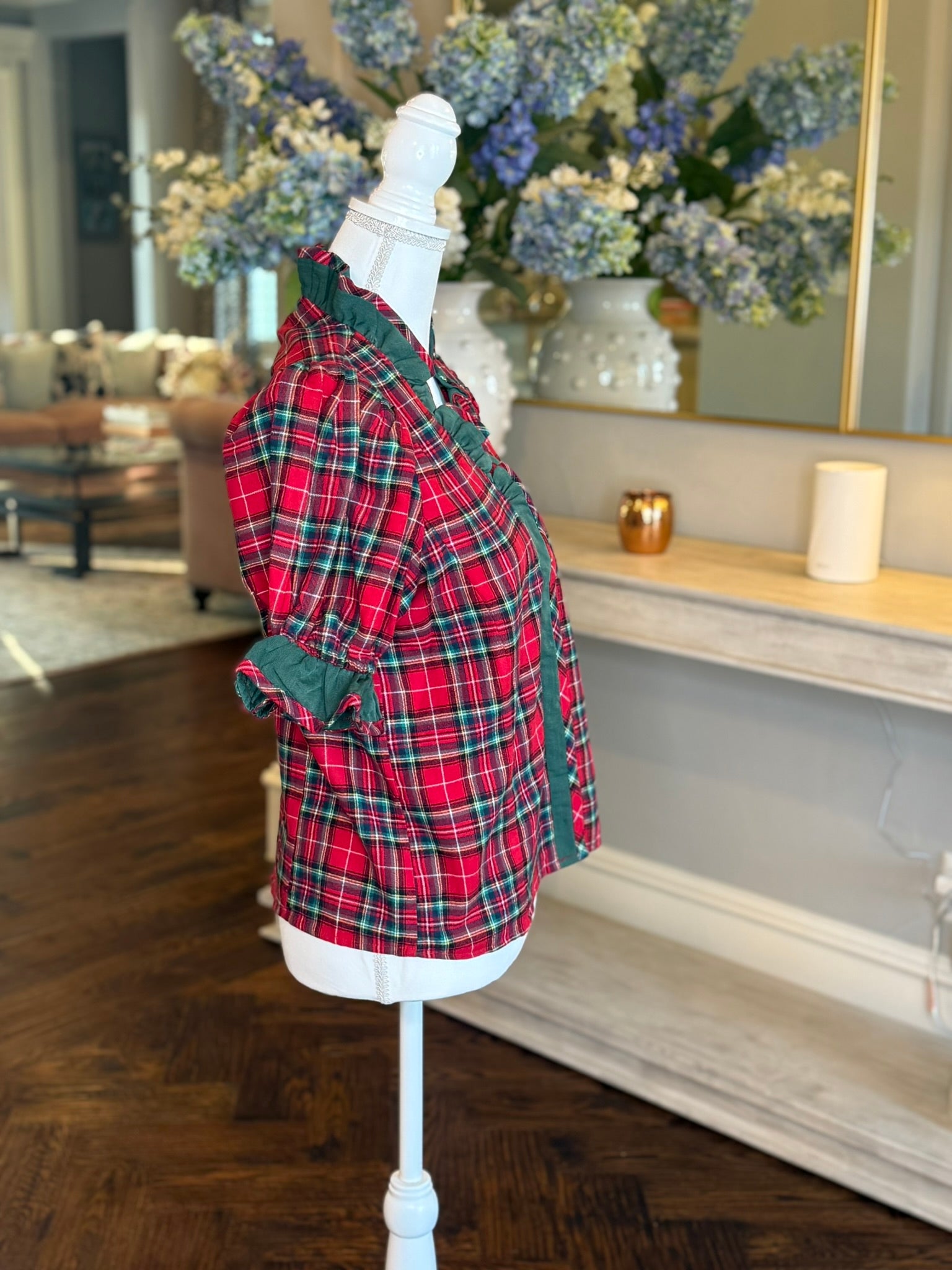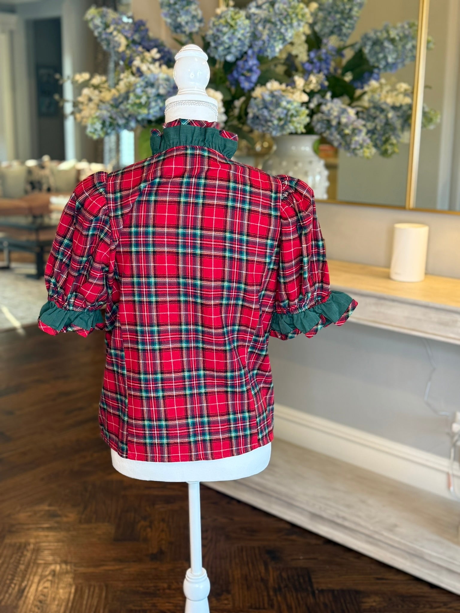 The Heather Top brings fun to your wardrobe with its playful plaid pattern and charming contrast ruffle trim. Lightweight and made from 100% breathable cotton, this woven short-sleeve shirt features a snap button closure for easy wear. Its unlined, none-sheer fabric keeps you cool and comfy, perfect for the upcoming holidays!