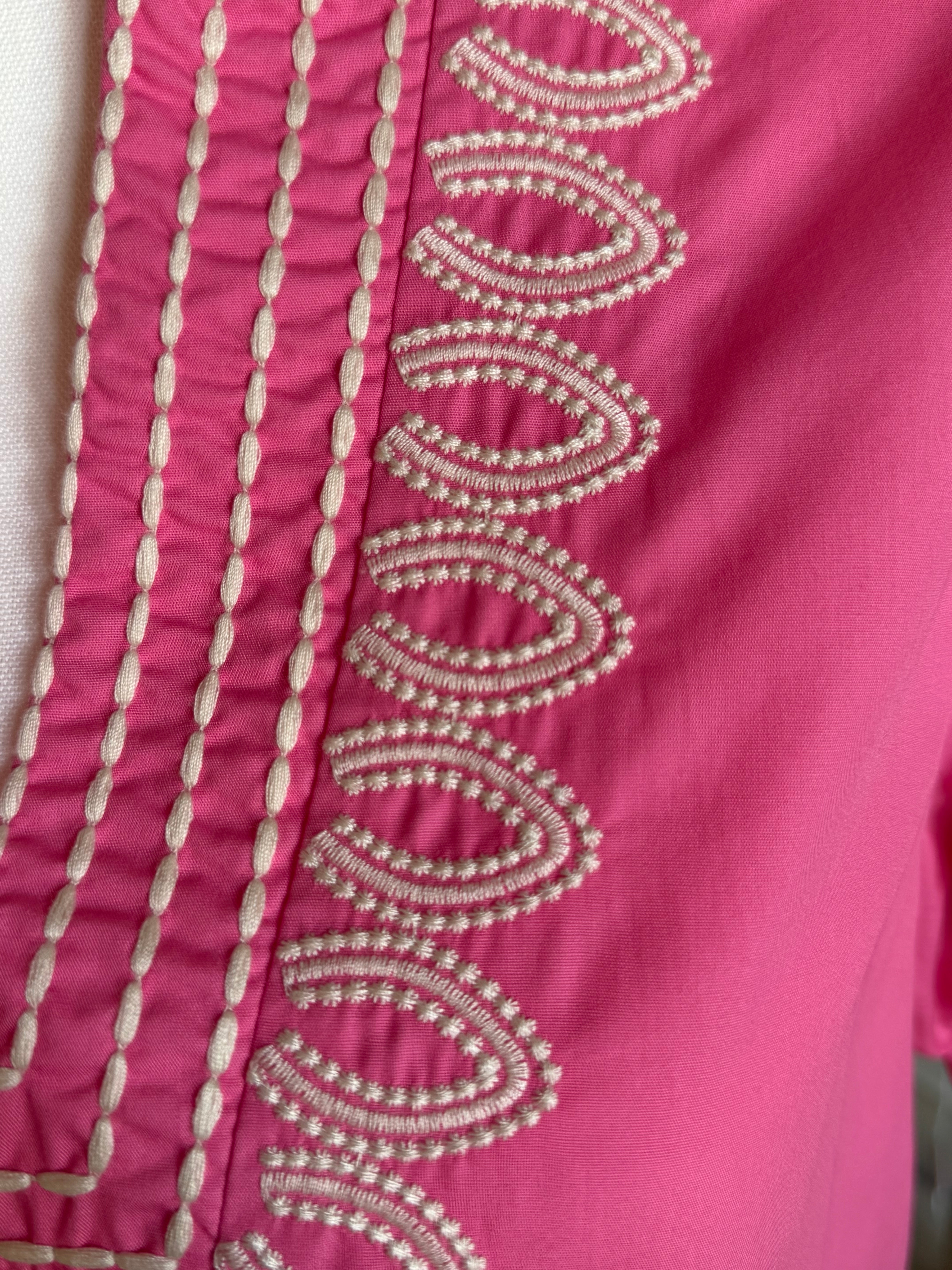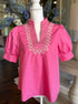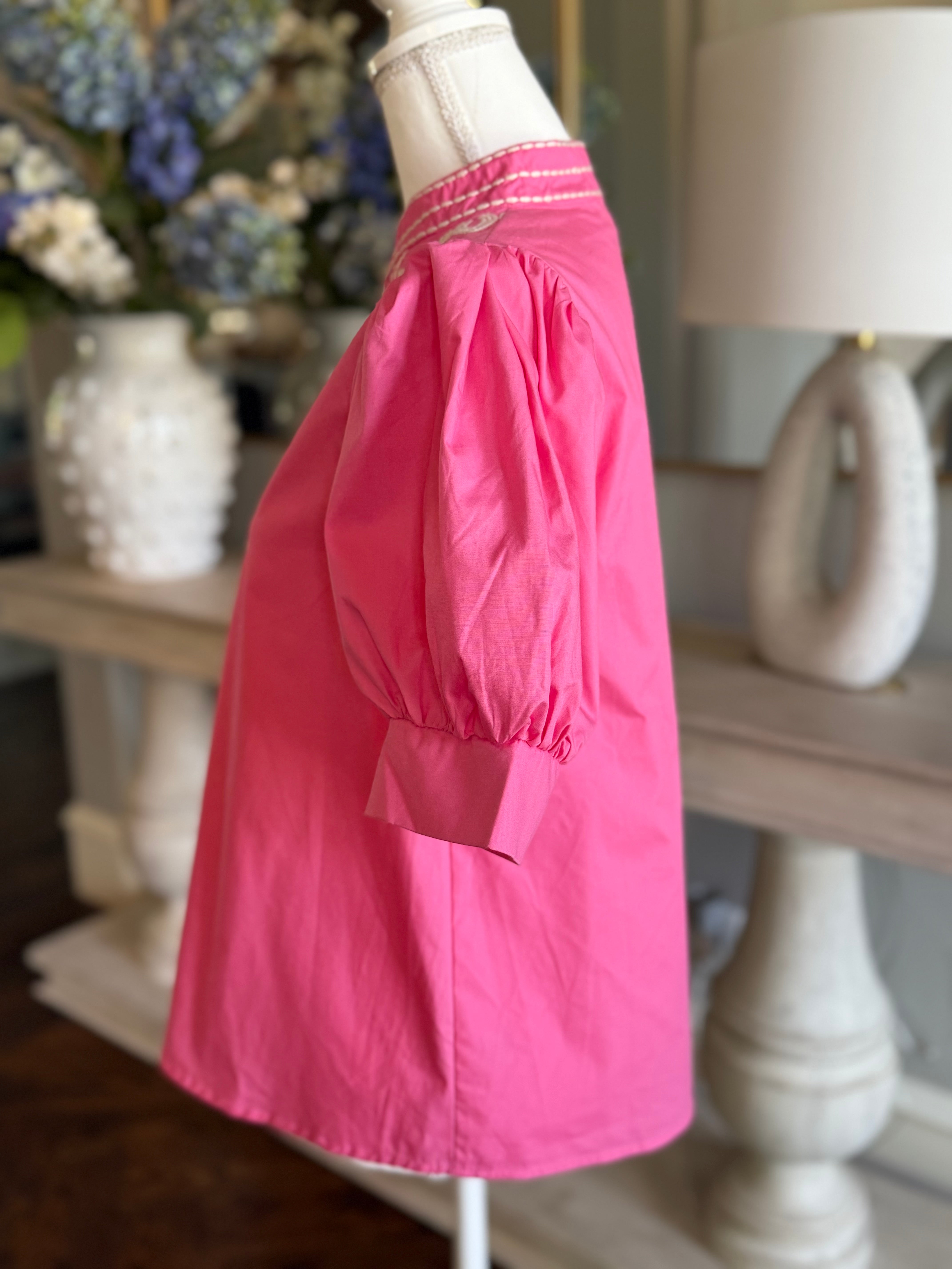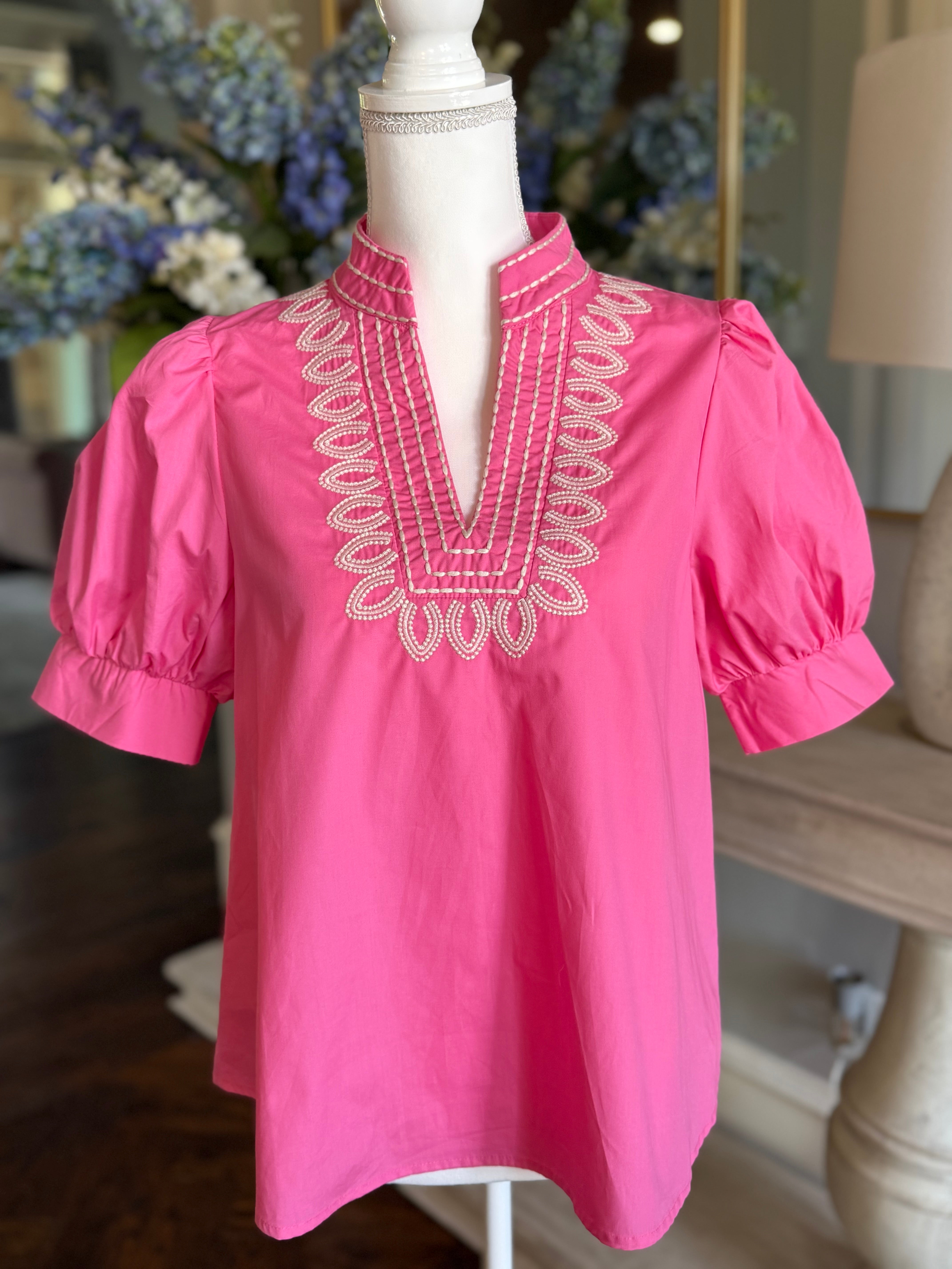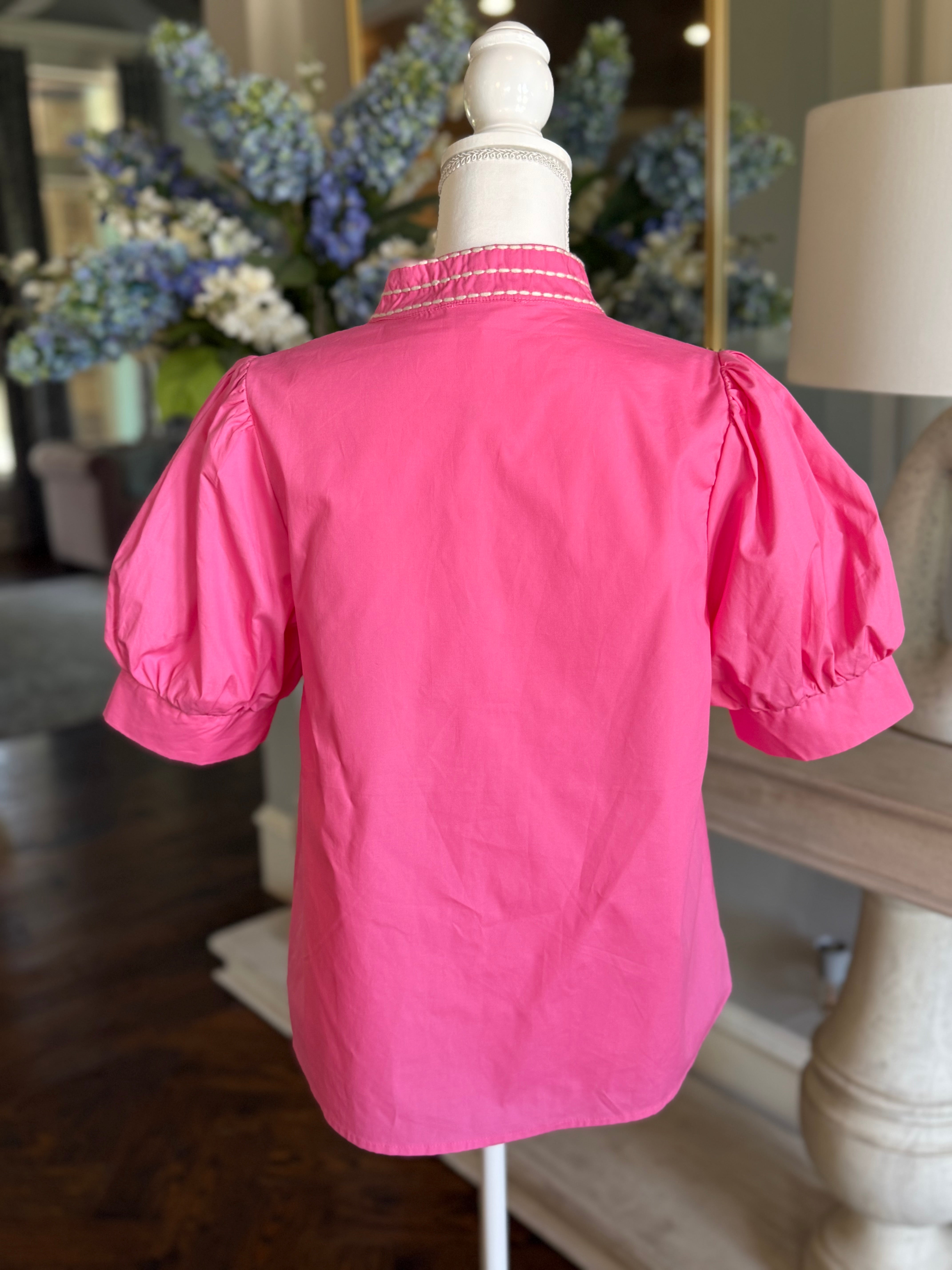 The Karen Blouse combines classic design with expert craftsmanship. Featuring a solid cuff band and short puff sleeves, this pullover top is detailed with an embroidered V-neck band collar for subtle elegance. Made from 100% lightweight, woven cotton, it offers breathability without sheerness. Unlined for comfort, it is best maintained with handwashing to preserve its quality and shape. Ideal for those seeking a refined yet effortless addition to their wardrobe.