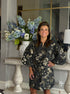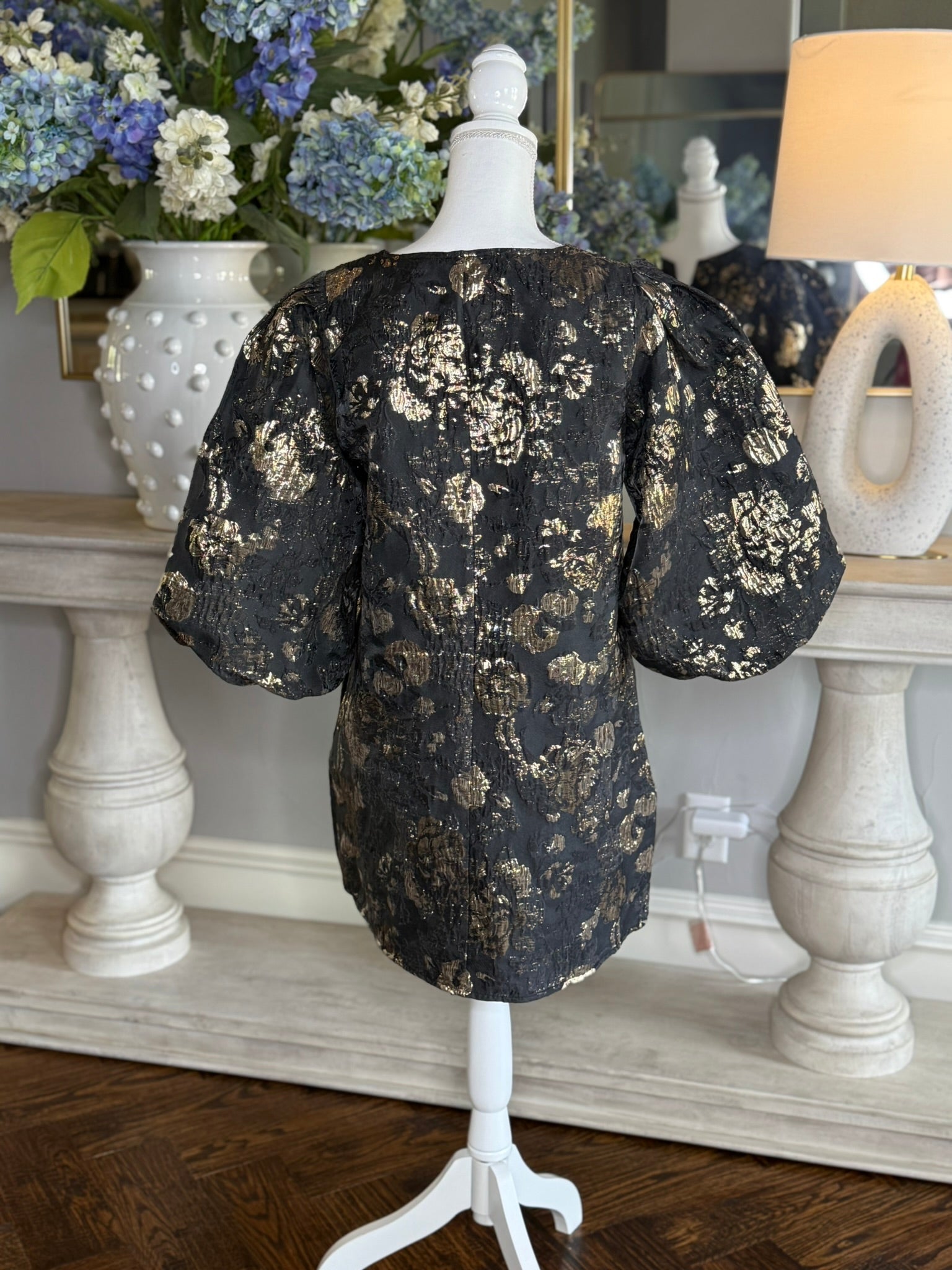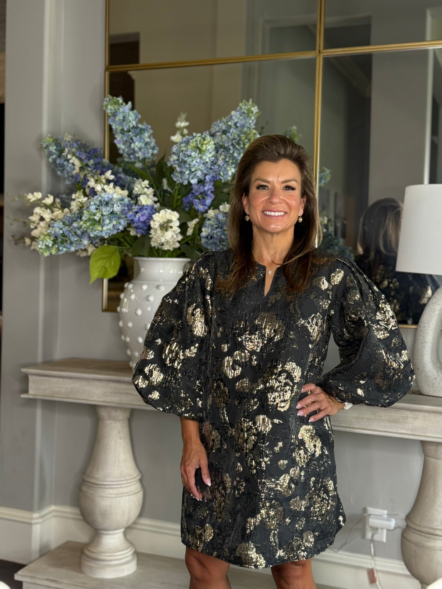 This elegant Kelly Dress in black features delicate 3/4 puff sleeves and a floral jacquard fabric that adds refined texture. The softly ruffled neckline enhances its sophisticated charm, making it ideal for holiday celebrations or stylish evenings out. Crafted from 100% polyester with a comfortable lining, it offers both grace and ease. Runs generous. Consider sizing down for a more fitted look.
