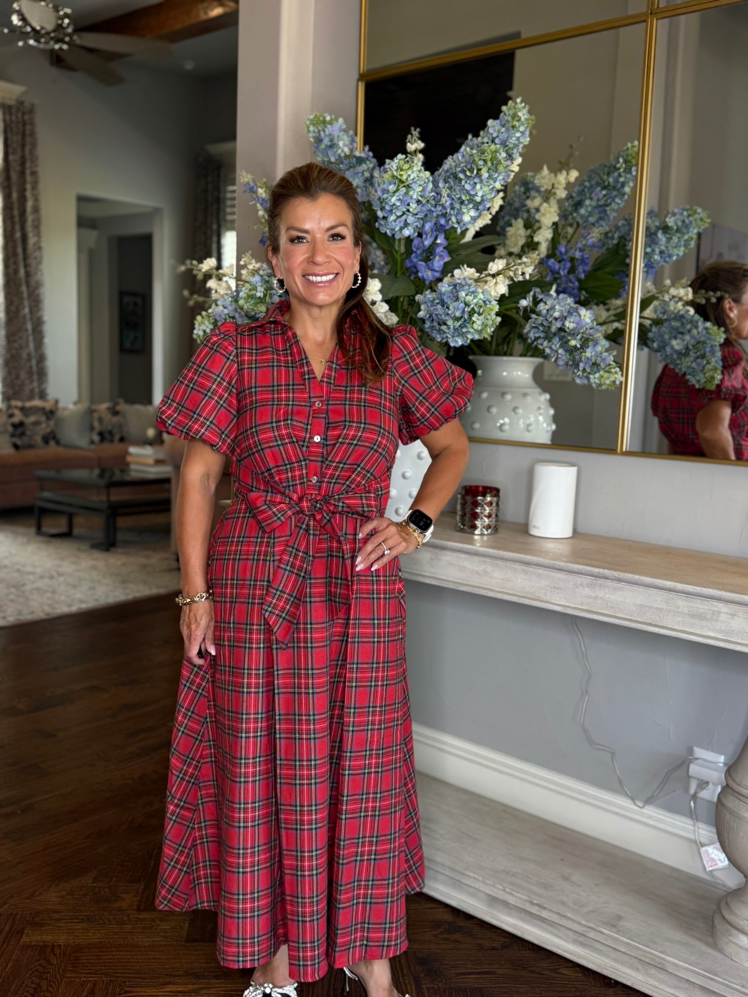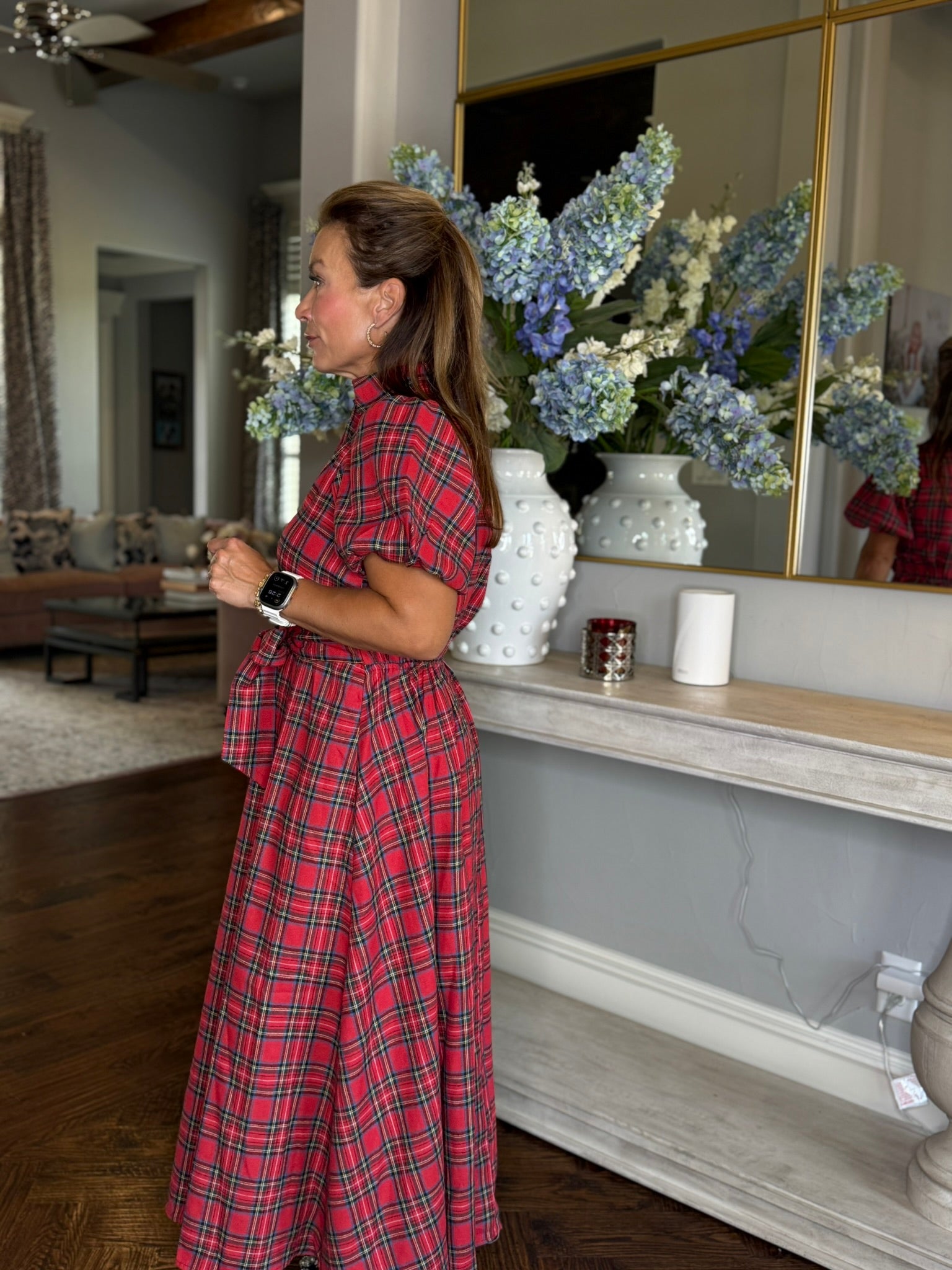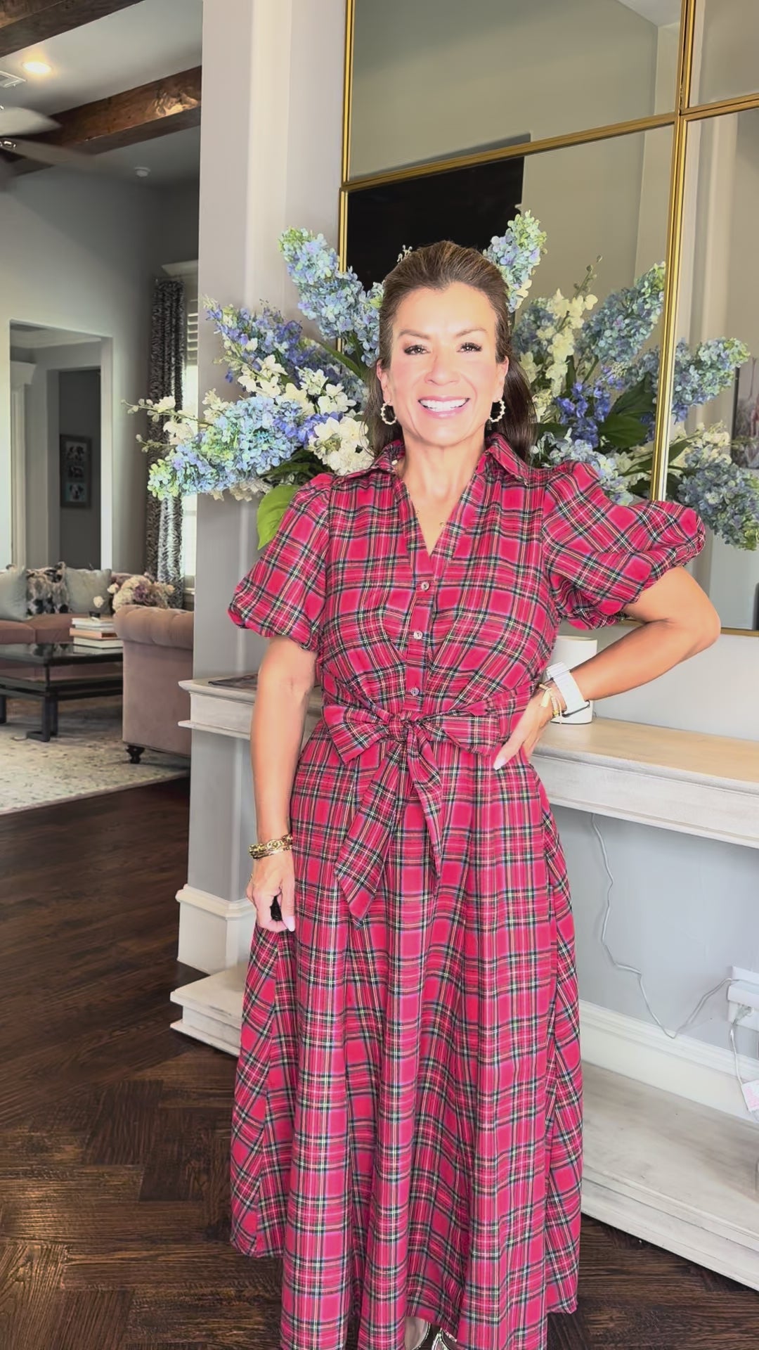 Elevate your wardrobe with the Lisa Dress, a refined red plaid midi featuring elegant puff sleeves and a tailored self-tie waist belt that defines your silhouette. Elastic waist at the back of the dress. The front button closure and discreet side pockets combine practicality with understated style. Crafted from a medium-weight woven fabric with a soft flannel texture, this lined dress offers both comfort and structure. Made of 65% polyester and 35% cotton, it ensures lasting quality and a polished finish for sophisticated occasions.