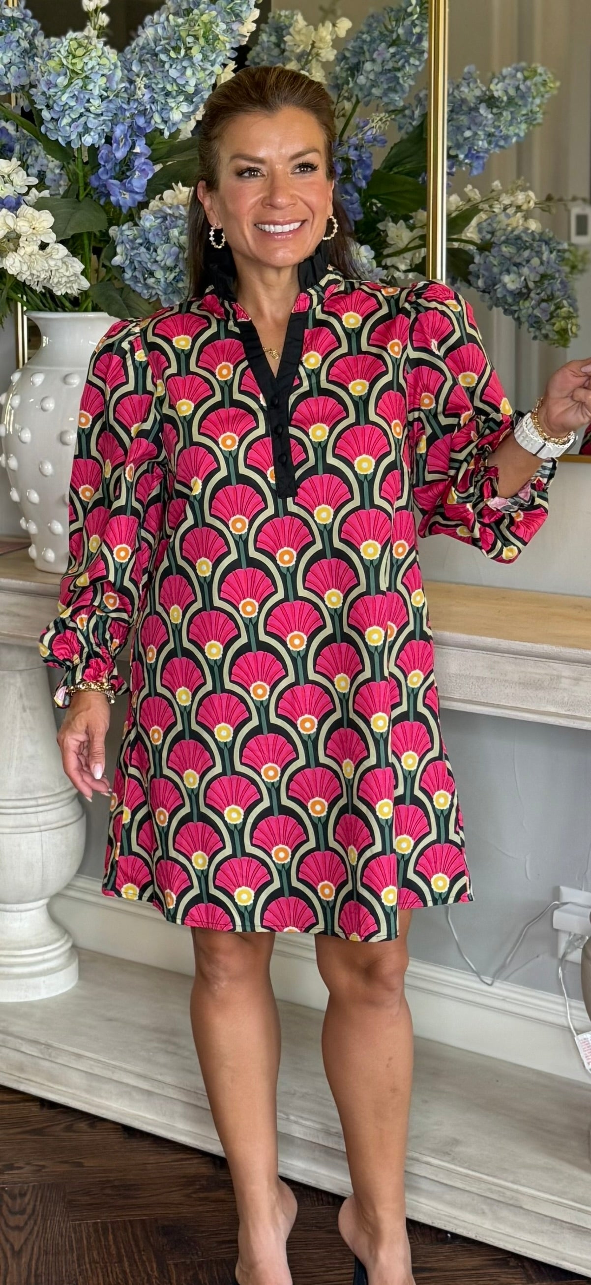 The Lisa dress offers a refined take on bohemian style with puffed shoulders and long sleeves that frame a delicate floral print. It has pops of color pinks, black, green and gold. Its flattering A-line shape is enhanced by thoughtful details like side pockets and a front button closure. The dress’s ruffled neckline and wrist elastic cuffs provide subtle sophistication, making it an elegant choice for both casual and dressier moments.