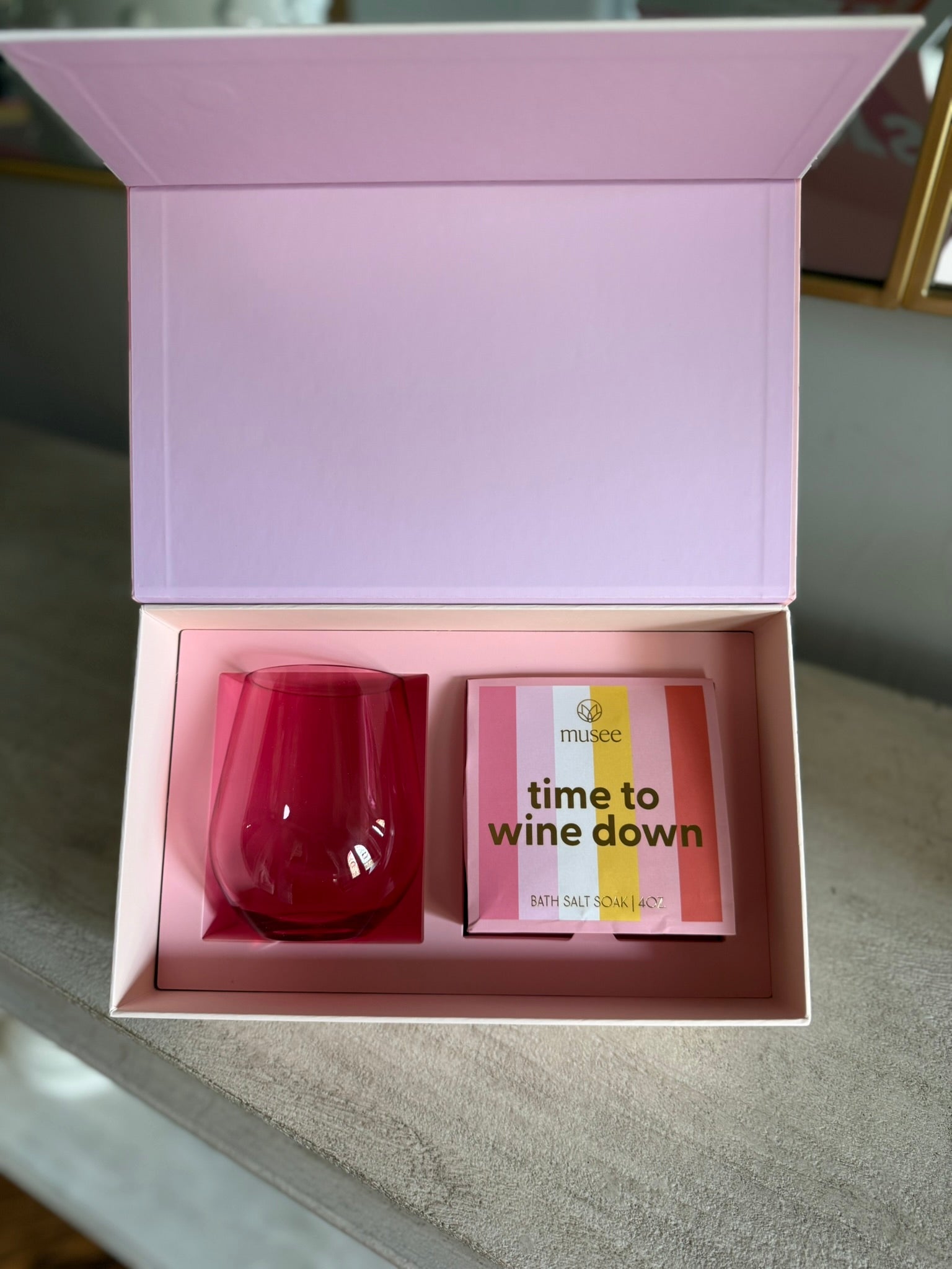 Celebrate in style with the Musee Wine Down Gift Box! This playful set includes a chic acrylic wine glass and three delightful bath salt packets—Prosecco, Rose, and Lavender scents—perfect for unwinding after any celebration. Housed in a glamorous gold-foiled box, each bath salt blend combines Epsom and Pacific Sea salts with soothing rosehip oil and uplifting geranium essential oil to turn your bath into a luxury soak. Raise a glass and relax with this perfect gift for any occasion!