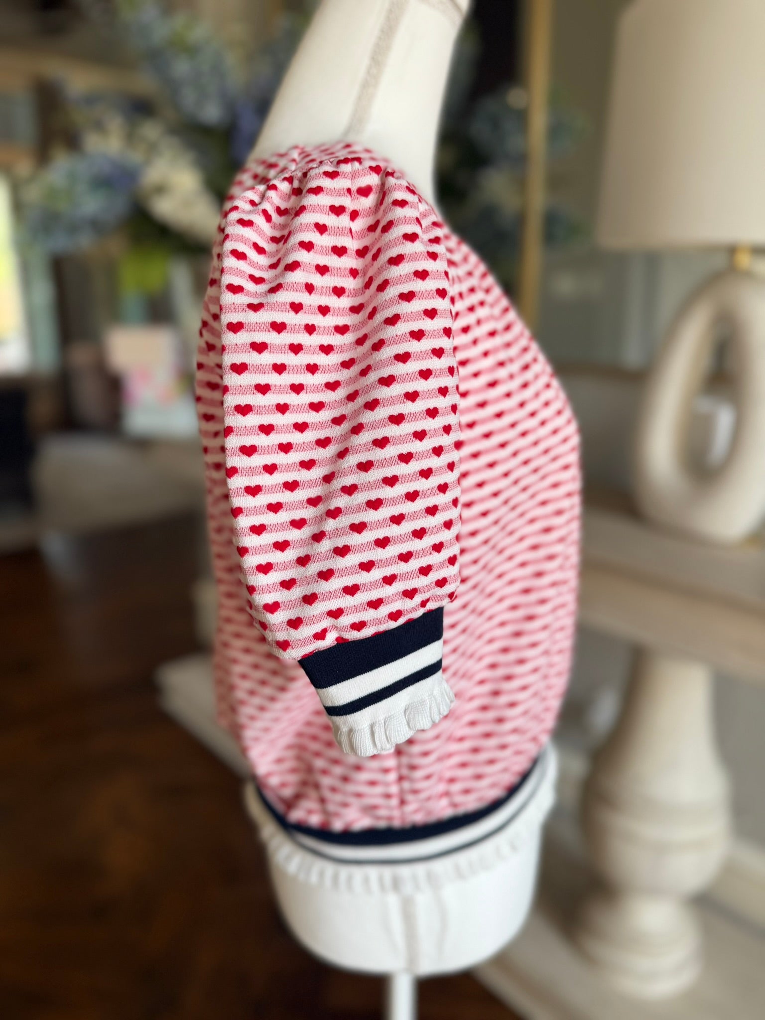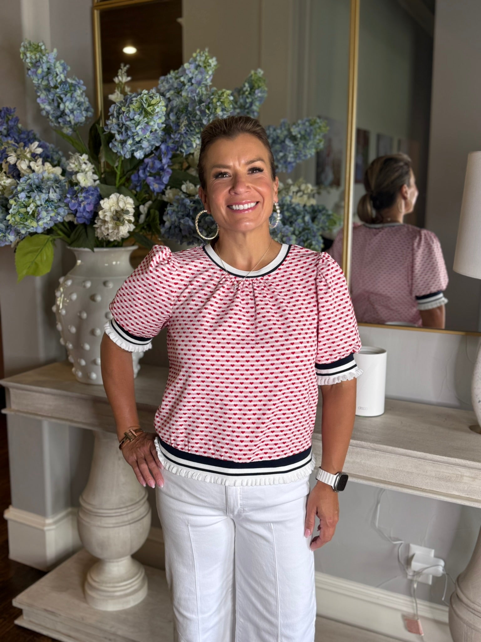Add a touch of whimsy to your wardrobe with the Rikki Top-Red. Featuring playful puff sleeves and a charming heart print, this top is finished with ruffle elastic at the bottom and sleeves for a flirty fit. The round neckline keeps it sweet and simple, while the soft blend of polyester and spandex ensures comfortable stretch. Perfect for hand washing to keep it looking fresh and fun!