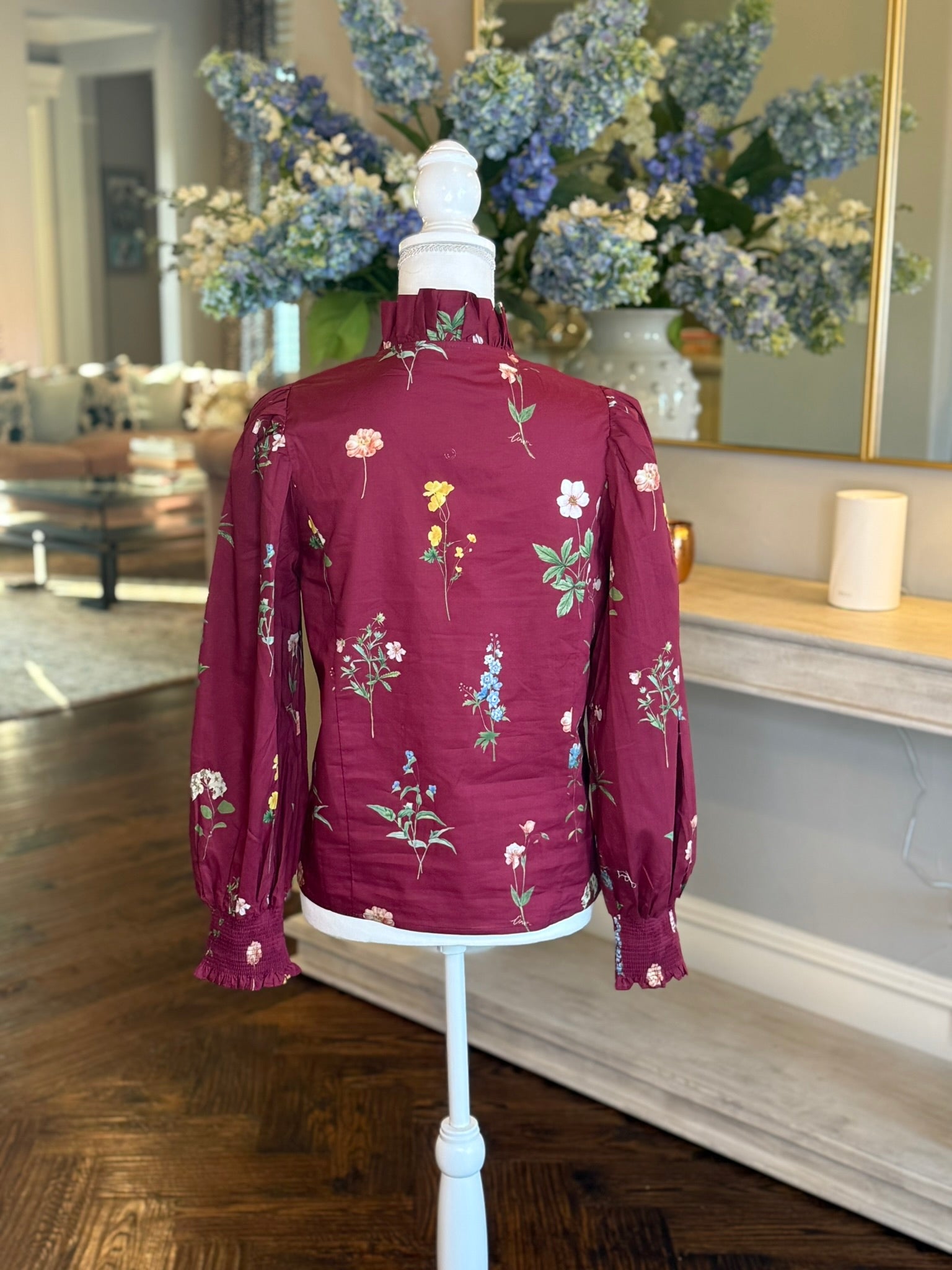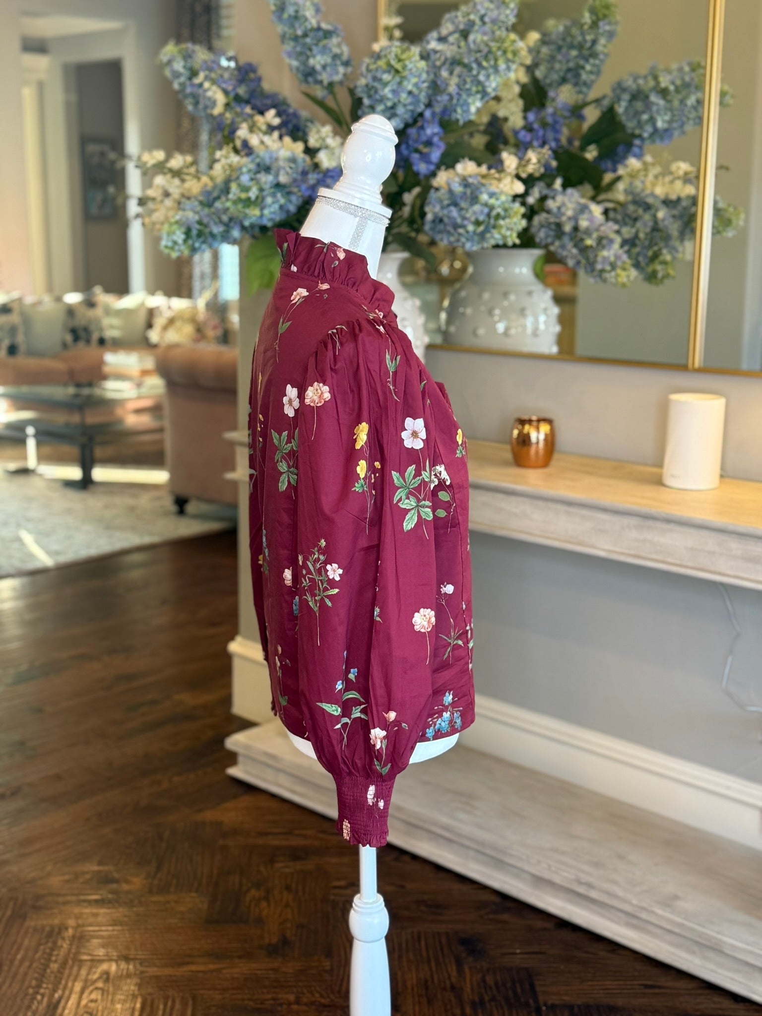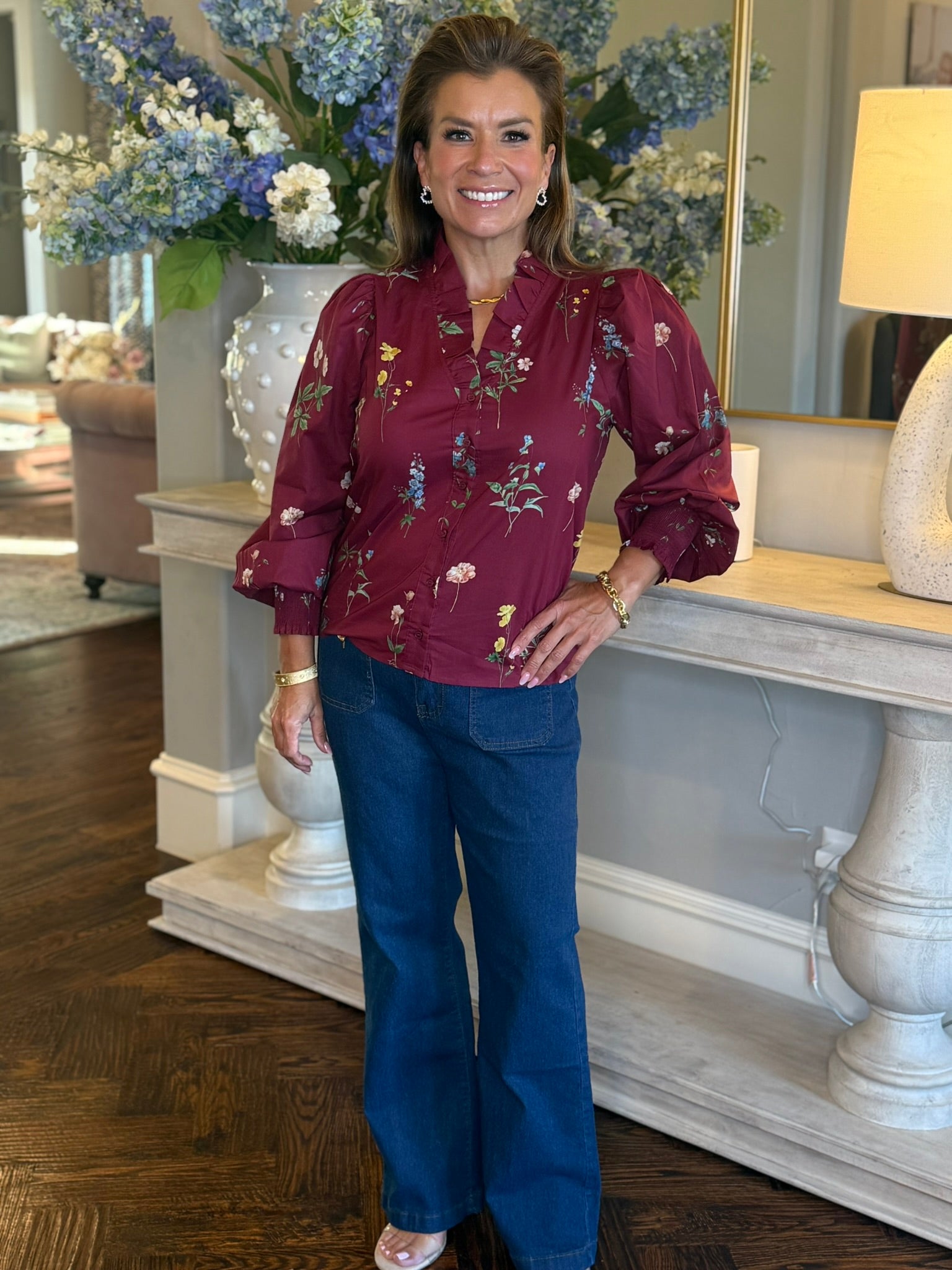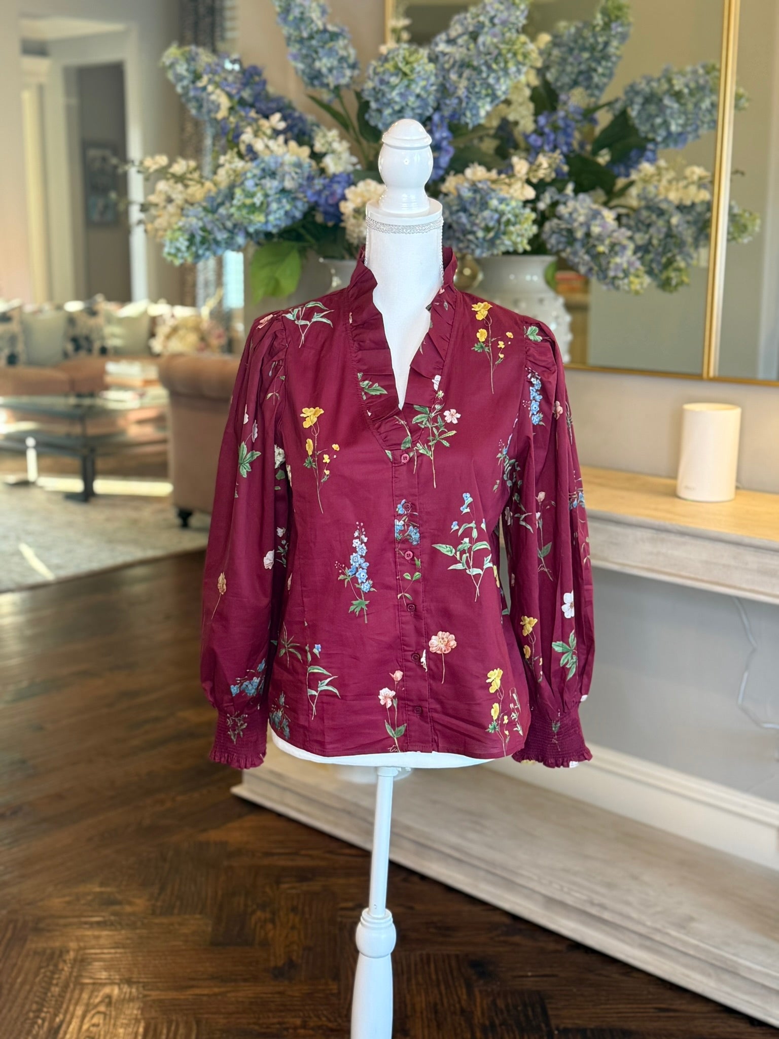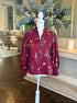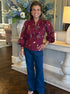The Susan Top adds a splash of playful charm with its rich burgundy floral print and sweet ruffle-accented V-neck. Lightweight and breathable, this 100% cotton woven top features smocked cuffs and a button-front closure for easy wear. Unlined and non-sheer, it’s perfect for keeping cool while turning heads wherever you go!
