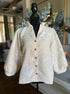Embrace cozy elegance with the Vonda Top in cream. This charming 3/4 sleeve button-down features a delicate white floral in a cream jacquard pattern and a ruffled mock neckline, adding a refined touch to your fall and winter wardrobe. Crafted from 100% polyester, it offers comfortable wear and easy care. Perfect for layering or wearing on its own, this top brings effortless style to any occasion.